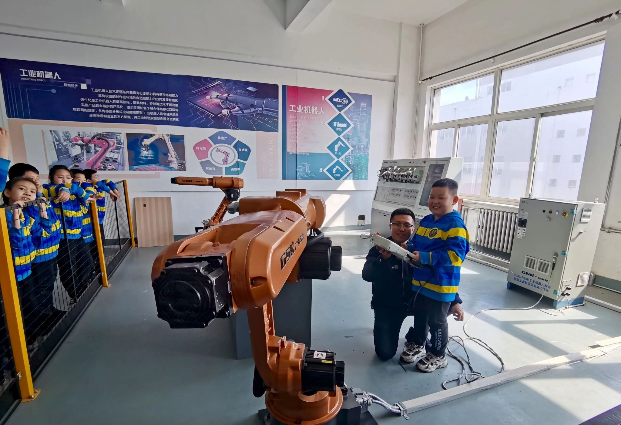 学生现场观看工业机器人的精准操作,了解其工作原理与实际应用,直观感受现代工业科技的魅力,激发了对科学探索的浓厚兴趣。